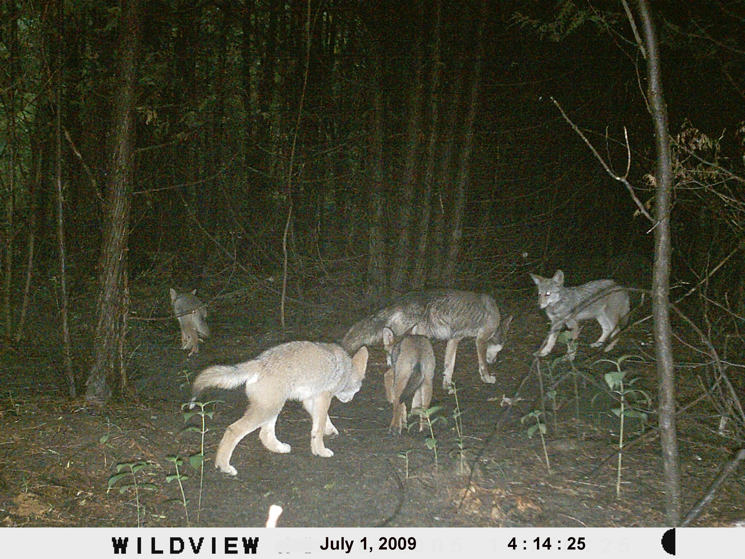 This photo was taken in the Altona Forest at the north west side near interpretative post #31 a little west of the new amphibian pond. As you can see, this photo is of 5 coyotes, possibly a family unit or part of the Altona Forest coyote pack which can be heard clearly howling in the late winter and early spring in this same area. Foot prints of deer and coyote abound in this area. The photo was taken early in the morning of July 1, 2009.